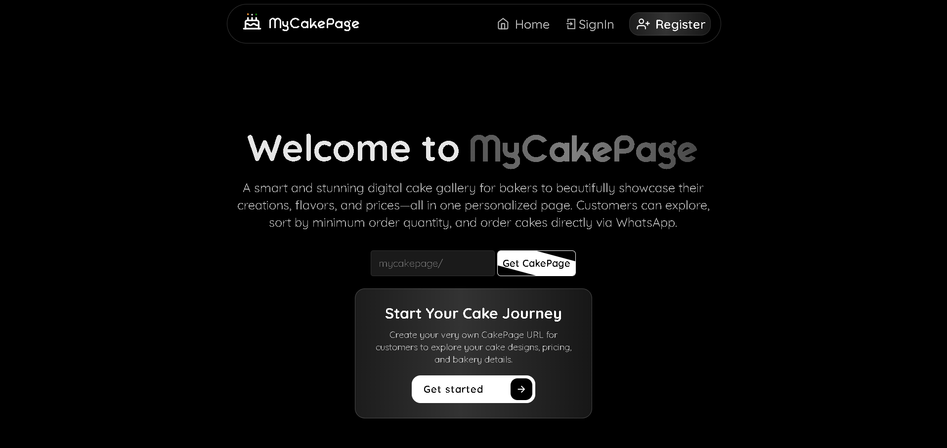 MyCakePage is a full-stack web application for bakery owners to showcase their cakes and manage online orders. Bakery owners can create their own custom storefront URLs, manage cakes, categories, flavours, pricing, and images using a Cloudinary-based admin panel. Customers can browse cakes, select flavours and quantities, and place orders via WhatsApp with pre-filled messages, streamlining the ordering process.